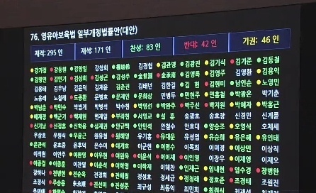 ¾Õ¼­ ±¹È¸´Â Àü³¯ º»È¸ÀǸ¦ ¿­¾î ¾î¸°ÀÌÁý CCTV ¼³Ä¡¸¦ Àǹ«È­ÇÏ´Â µîÀÇ ³»¿ëÀÌ ´ã±ä ¿µÀ¯¾Æº¸À°¹ý °³Á¤¾ÈÀ» Ç¥°á¿¡ ºÎÃÆÁö¸¸, Àç¼® 171¸í °¡¿îµ¥ Âù¼º 83¸í, ¹Ý´ë 42¸í, ±â±Ç 46¸íÀ¸·Î, Àǰá Á¤Á·¼öÀÎ Ãâ¼®ÀÇ¿ø °ú¹Ý¼ö(86¸í) Âù¼ºÀ» ¾òÁö ¸øÇØ ºÎ°áµÆ´Ù.