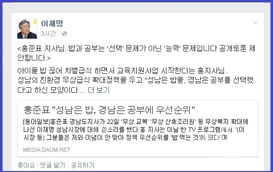 ÀÌÀç¸í ½ÃÀåÀº Á¦¸ñ¿¡ ÀÌ¾î “¾ÆÀÌµé ¹ä ²÷¾î Â÷º°±Þ½Ä ÇÏ¸é¼ ±³À°Áö¿ø»ç¾÷ ½ÃÀÛÇÑ´Ù´Â È« Áö»ç´Ô, ¼º³²ÀÇ Ä£È¯°æ ¹«»ó±Þ½Ä È®´ëÁ¤Ã¥À» µÎ°í ‘¼º³²Àº ¹äÀ», °æ³²Àº °øºÎ¸¦ ¼±ÅÃÇß´Ù’°í ÇϽЏð¾ç”À̶ó¸ç ÃÖ±Ù È«ÁØÇ¥ Áö»ç°¡ ¾ð·ÐÀ» ÅëÇØ ¼º³²ÀÇ ¹«»óº¹Áö¸¦ ÆïÈÑÇÑ »ç½Ç¿¡ ´ëÇØ ¹Ý·Ð¼º dzÀÚ¸¦ ÀØÁö ¾Ê¾Ò´Ù.