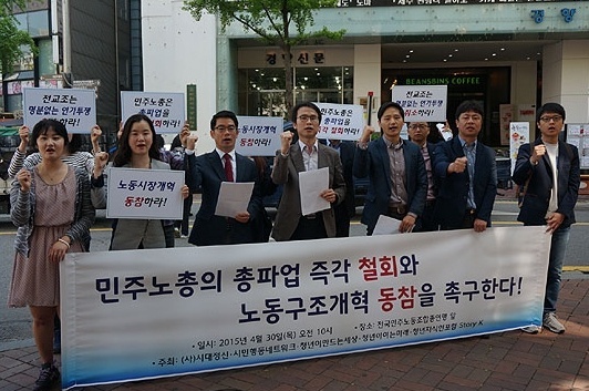û³â·½Ã¹Î´Üü°¡ "¹ÎÁÖ³ëÃÑÀº ÃÑÆÄ¾÷À» Áï°¢ öȸÇÏ°í ³ëµ¿±¸Á¶°³Çõ ³íÀÇ¿¡ µ¿ÂüÇ϶ó"°í 30ÀÏ Ã˱¸Çß´Ù. ½Ã´ëÁ¤½Å°ú ½Ã¹ÎÇൿ³×Æ®¿öÅ©, û³âÀ̸¸µå´Â¼¼»ó µî 5°³ ´Üü´Â À̳¯ ¿ÀÀü ¼­¿ï Áß±¸ Á¤µ¿ ¹ÎÁÖ³ëÃÑ ¾Õ¿¡¼­ ±âÀÚȸ°ßÀ» ¿­°í "¹ÎÁÖ³ëÃÑÀÇ ÃÑÆÄ¾÷Àº ½Ç»ó ´ë±â¾÷ Á¤±ÔÁ÷ ±Ù·ÎÀÚ¿Í °ø¹«¿øÀÇ ±âµæ±ÇÀ» Áö۱â À§ÇÑ °Í"À̶ó°í ÁÖÀåÇß´Ù.