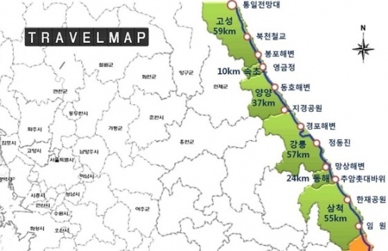 * °í¼º 59km, ¼ÓÃÊ 10km, ¾ç¾ç 37km, °¸ª 57km, µ¿ÇØ 24km, »ïô 55km