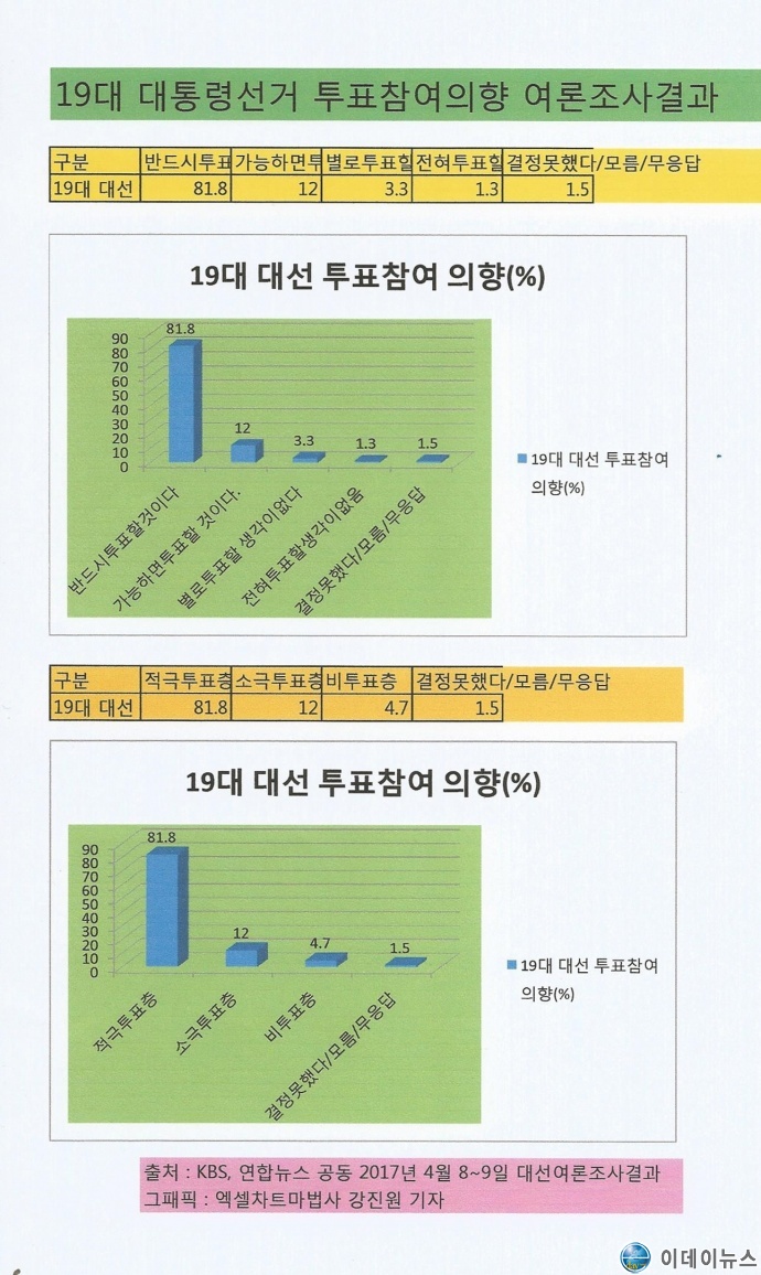 ÇÑÆí ¡¸19´ë ´ëÅë·É ¼±°Å ÅõÇ¥Âü¿©ÀÇÇâ ¿©·ÐÁ¶»ç°á°ú¡¹¿¡¼´Â ¹Ýµå½Ã ÅõÇ¥ÇÒ°ÍÀÌ´Ù 81.8%, °¡´ÉÇϸé ÅõÇ¥ÇÒ°ÍÀÌ´Ù 12%, º°·Î ÅõÇ¥ÇÒ »ý°¢ÀÌ ¾ø´Ù 3.3%, ÀüÇô ÅõÇ¥ÇÒ »ý°¢ÀÌ ¾ø´Ù 1.3%, °áÁ¤ ¸øÇ߰ųª ¸ð¸§ ¹«ÀÀ´ä 1.5%·Î Á¶»çµÇ¾úÀ¸¸ç, ÅõÇ¥Âü¿©ÀÇÇâ ¼ºÇ⺰·Î´Â Àû±ØÅõÇ¥Ãþ 81.8%, ¼Ò±ØÅõÇ¥Ãþ 12%, ºñÅõÇ¥Ãþ 4.7%, °áÁ¤ ¸øÇ߰ųª ¸ð¸§ ¹«ÀÀ´ä 1.5%·Î Á¶»çµÇ¾ú´Ù.