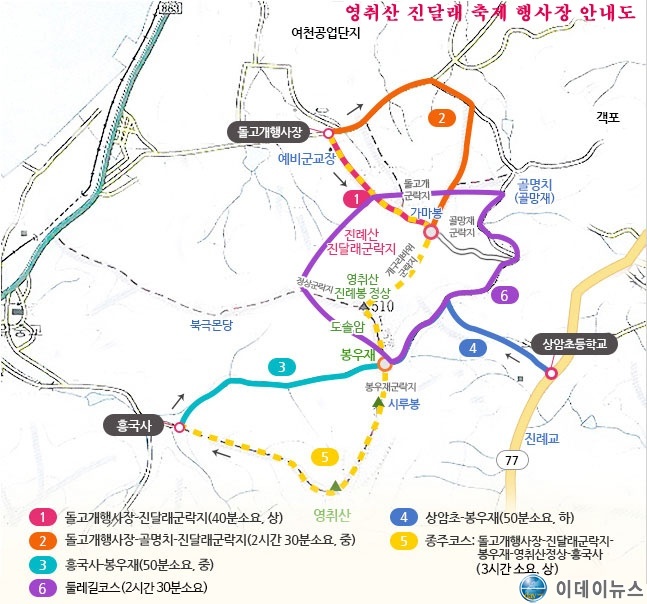 Èï±¹»ç¸¦ ¿·À¸·Î ÇÏ°í µî»ê·Î¸¦ 30ºÐ °¡·® ¿Ã¶ó¿Í¼ º¸°Ô µÇ´Â ¿µÃë»ê ÀÚ¶ôÀº ¿¬ºÐÈ«»ö ¹°°¨À» »Ñ·Á ³õÀº µí ÇÑ Âø°¢À» ºÒ·¯ÀÏÀ¸Å³ Á¤µµ·Î ¸¸°³ÇÑ Áø´Þ·¡²ÉÀÌ º¸´Â »ç¶÷ÀÇ Åº¼ºÀ» ÀھƳ½´Ù. Áø´Þ·¡²É¹ç »çÀÌ¿¡¼ ¹ú¾îÁö´Â °¢Á¾ Çà»çµµ °ü±¤°´µéÀÇ ¹ß±æÀ» ²ô´Âµ¥, ¿µÃë»êÁø´Þ·¡Çà»ç¾È³»ÀÇ Á¤½ÅÀûÀÎ ÁöÁÖ ¿ªÇÒÀ» ÇÏ´Â »ê½ÅÁ¦°¡ ¿µÃë»êÁø´Þ·¡Çà»ç¾È³»ÀÇ ÁÖÃàÀ» ÀÌ·ç´Â Çà»çÀÌ´Ù.