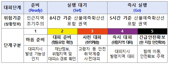 ÀÌ¿¡ Á¤ºÎ´Â ÇàÁ¤¾ÈÀüºÎ, »ê¸²Ã» µî°ú ÇÔ²² Æò±Õdz¼Ó»Ó¸¸ ¾Æ´Ï¶ó ÃÖ´ë¼ø°£Ç³¼Óµµ °í·ÁÇØ »êºÒÈ®»ê¿¹Ãø½Ã½ºÅÛÀ» ÀÛ¼ºÇϰí, À̸¦ Åä´ë·Î ÁֹδëÇÇ °¡À̵å¶óÀÎÀ» ¸¶·ÃÇß´Ù. ¿¹Ãø °á°ú ȼ±µµ´Þ°Å¸® 5½Ã°£ À̳» `À§Ç豸¿ª` ÁÖ¹ÎÀº Áï½Ã ´ëÇÇÇϰí, 8½Ã°£ À̳»´Â `ÀáÀçÀû À§Ç豸¿ª`À¸·Î Á¤ÇØ ´ëÇÇ Áغñ¸¦ Çϵµ·Ï Çß´Ù.